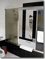 洗面所もとても広いです。トイレとシャワーは一緒の部屋にあります。アメニティは歯ブラシ以外は置いてありました。シャワーはガラスで仕切られていて、浴槽もあります。お湯の出が非常に弱いのが難点です。なぜか上部に固定されたシャワーヘッドと、ホースのシャワーヘッドの二つがあったのですが、特に上部のヘッドの出が悪く、ここはなんとかしてほしいところです。洗面所には通気口があるので、夜には虫が入ってきます。