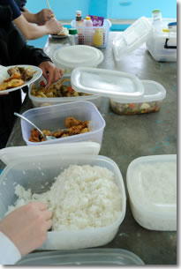 午前の二本を潜ったところで、サウスドックで昼食です。桟橋にあがってみると、どこかで見たような覚えのある人が...そうそう2007年2月に乗船したBSⅡで一緒だった方ではないですか!ダイビングをやっていると、また別の海で会えたりするものなんですね~。