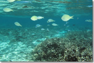 釣りの人たちがいるところを超えたところで海に入ってヒルトンの方まで泳いで見ることにしましたが、午後になって潮が引いてきているようでとても浅くなっています。珊瑚の上は、浅すぎてシュノーケリングもできないぐらいになっているため、あきらめて戻ることにしました。途中でツマグロを見かけました。