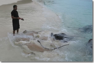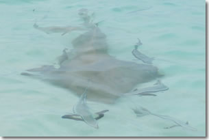 夕方に桟橋でエイの餌付けが毎日開催されているので行ってみます。スタッフがエイに餌付けをするのですが、足の近くに数匹が寄っていてなかなか迫力があります。エイだけでなくナースシャークやマルコバンなども寄ってきています。スタッフが餌を投げると、すごい速度で追っていく魚がいたりします。この餌付けには、ダイビングでもシュノーケリングでもまず見ることができないトンガリサカタザメもやってきます。警戒心が高くてなかなかスタッフから餌をもらえずに「頑張れ!」と声をかけたくなりますが、ちゃんとスタッフが直接エサをあげていました。